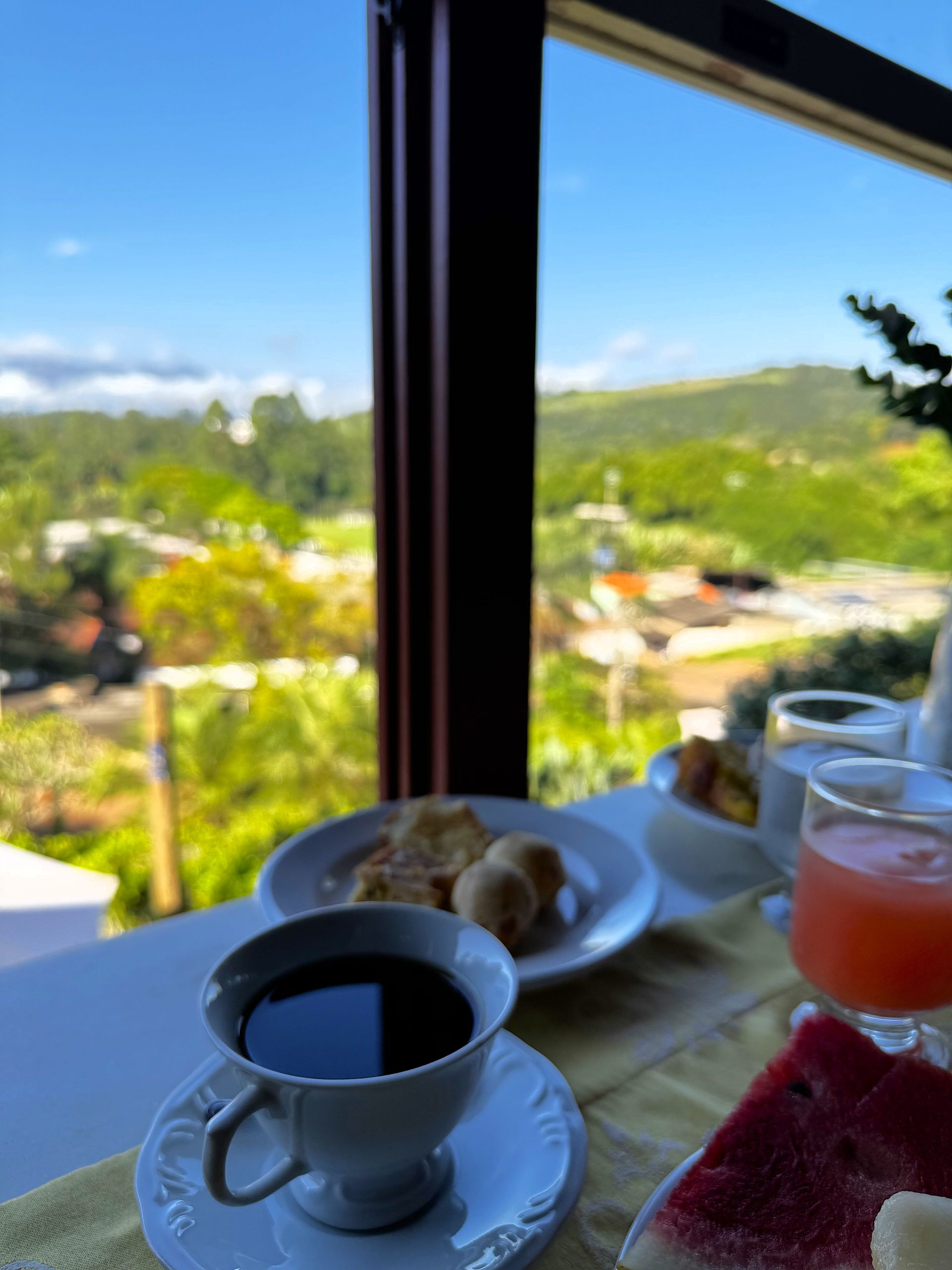 Em nosso acolhedor Salão de Café, na sede do hotel, você desfrutará do nosso delicioso café da manhã, com uma vista panorâmica deslumbrante da Serra do Caraça.